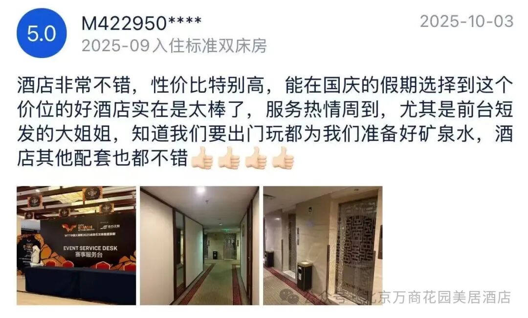 此次,北京万商花园美居酒店圆满完成“WTT中国青少年大满贯2025”的接待任务,成功打造文商旅体新体验。我们为球迷和宾客创造一个不仅可住,更可赏、可玩、可分享、可回味的沉浸式体验空间。