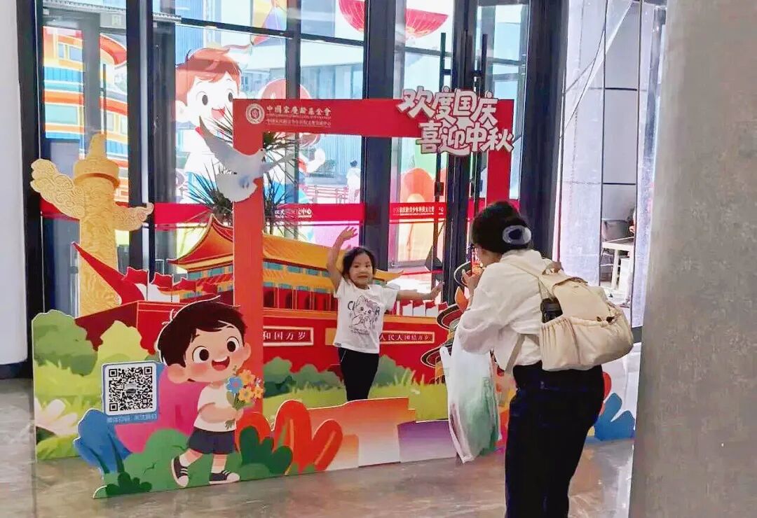 中国宋庆龄青少年科技文化交流中心广场上,“欢度国庆 喜迎中秋”花坛色彩明艳,家长们纷纷举起手机,为孩子定格与花坛同框的瞬间。“每年十一都会带孩子拍张‘国庆照’,今年参加中心的双节活动,希望从小给孩子种下心怀家国的种子。”家长吴女士说。