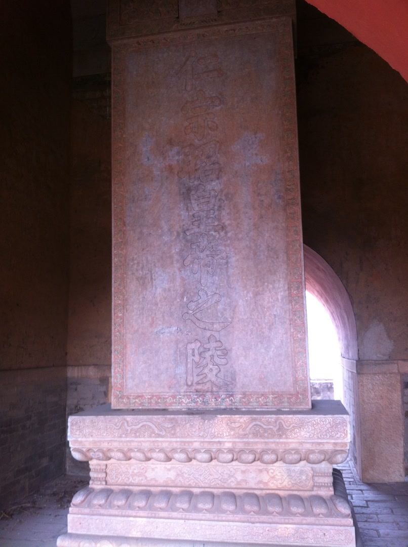 该基址为十米见方的正方形,四周残存着清代砌筑的宇墙(为清代保护碑亭而建),正中便是螭首龟趺的献陵神功圣德碑,这座碑上并没有文字,原因是该碑为嘉靖年间所添补,当时在位的明世宗秉承“只树碑,不写文字”的原则,所增补的献、景、裕、茂、泰、康六陵,包括长陵的龙趺碑,最终就都成了无字碑(长陵龙趺碑上文字系清代所刻)。