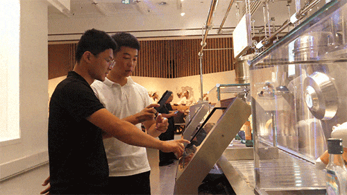来到DIY互动区,游客扫码后,不仅能定制专属风味酒品,还能亲手设计酒标,轻松带走独一无二的文化苑定制酒。