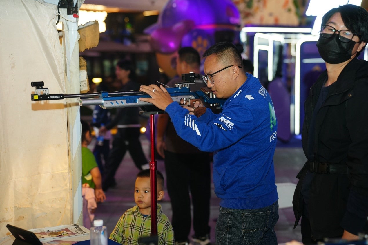 匹克球赛场不远处的Pump To Fight 1v1街舞大赛,少年街舞高手齐聚一堂,动感的音乐、炫酷的舞步引得观众阵阵喝彩。小选手们用充满创意的动作和极具感染力的表现,展示着青春的力量与激情。速得尔科技激光射击体验区也吸引了不少市民尝试,参与者手持激光枪,屏息凝神、瞄准击发,仿佛置身奥运赛场。