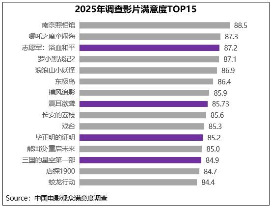 从影片来看,作为抗美援朝“志愿军”三部曲终章的《志愿军:浴血和平》三大指数全面领衔,其中思想性得分88.0分,居2025年第二位,居第一的是《南京照相馆》88.9分,这两部影片都通过银幕再现残酷战争史实,承载着厚重的民族情感和历史责任感。