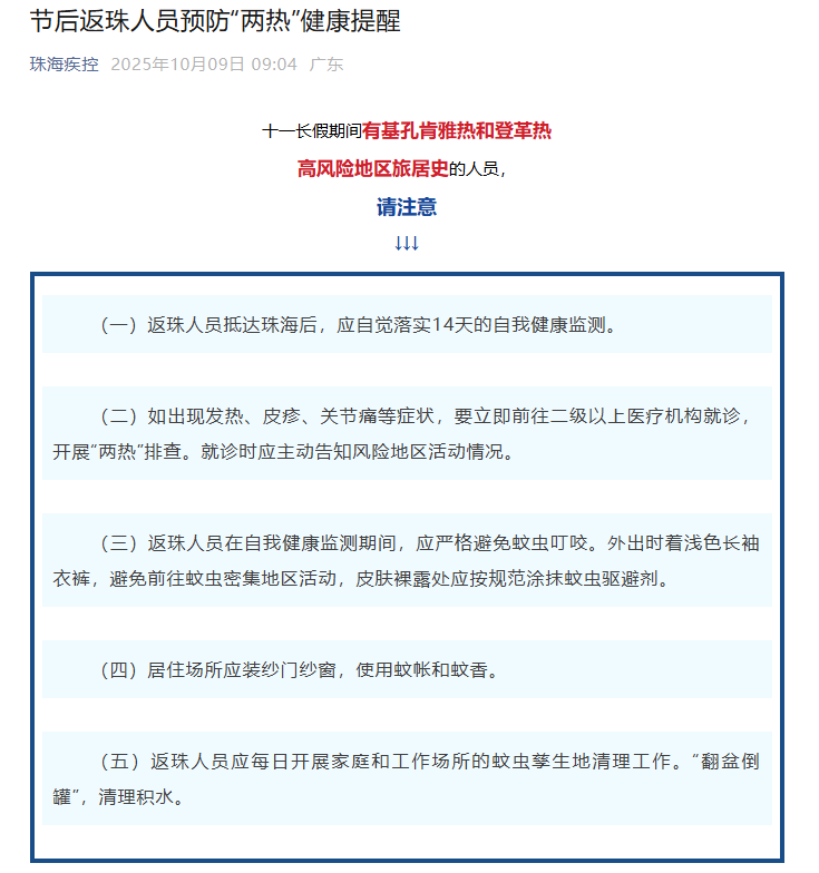 珠海疾控9日上午发布节后返珠人员预防“两热”健康提醒,十一长假期间有基孔肯雅热和登革热高风险地区旅居史的人员,请注意: