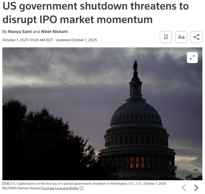 路透社报道,政府关门导致证券交易委员会关闭,IPO文书处理暂停,这无疑将影响市场情绪。