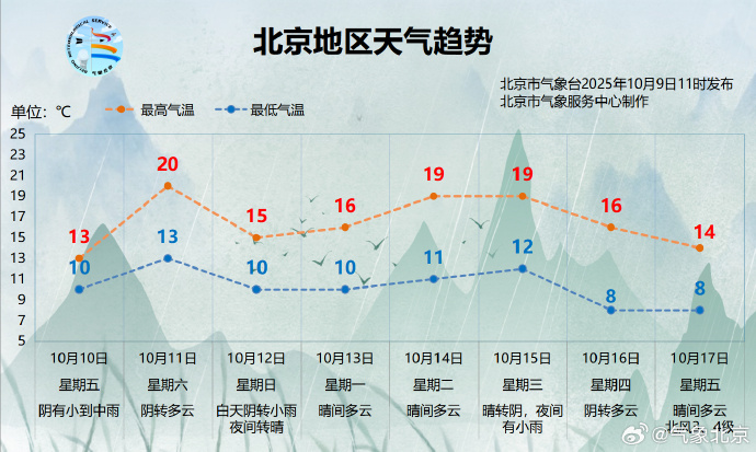 本周六(10月11日)要上班,别忘了定好闹钟。11日秋雨暂歇,天空云量较多,气温有所回升,白天最高气温升至20℃上下。