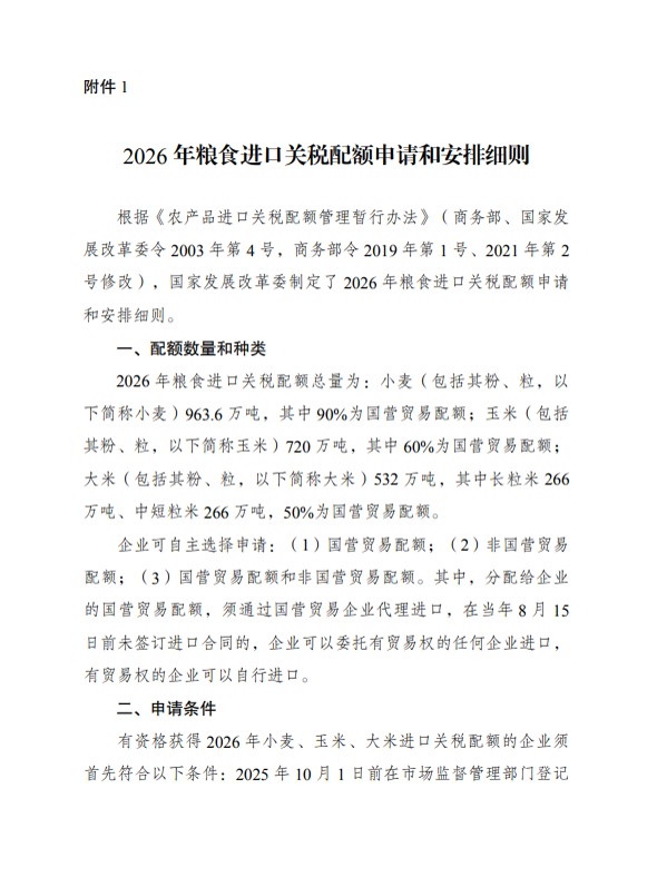 国家发改委发布2026年粮食进口关税配额申请和安排细则。其中,2026年粮食进口关税配额总量为:小麦(包括其粉、粒,以下简称小麦)963.6万吨,其中90%为国营贸易配额;玉米(包括其粉、粒,以下简称玉米)720万吨,其中60%为国营贸易配额;大米(包括其粉、粒,以下简称大米)532万吨,其中长粒米266万吨、中短粒米266万吨,50%为国营贸易配额。