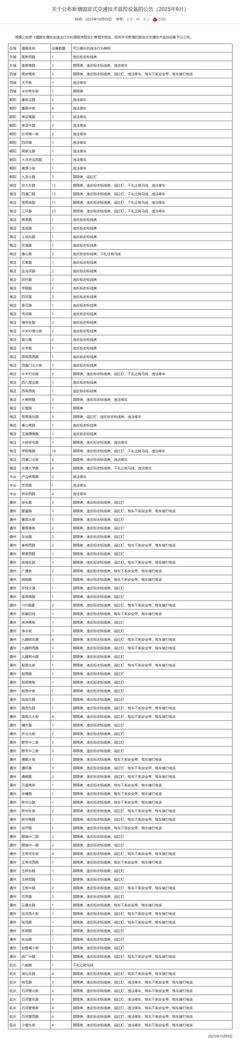 10月9日,北京市公安局公安交通管理局网站发布《关于公布新增固定式交通技术监控设备的公告(2025年9月)》,详情如下: