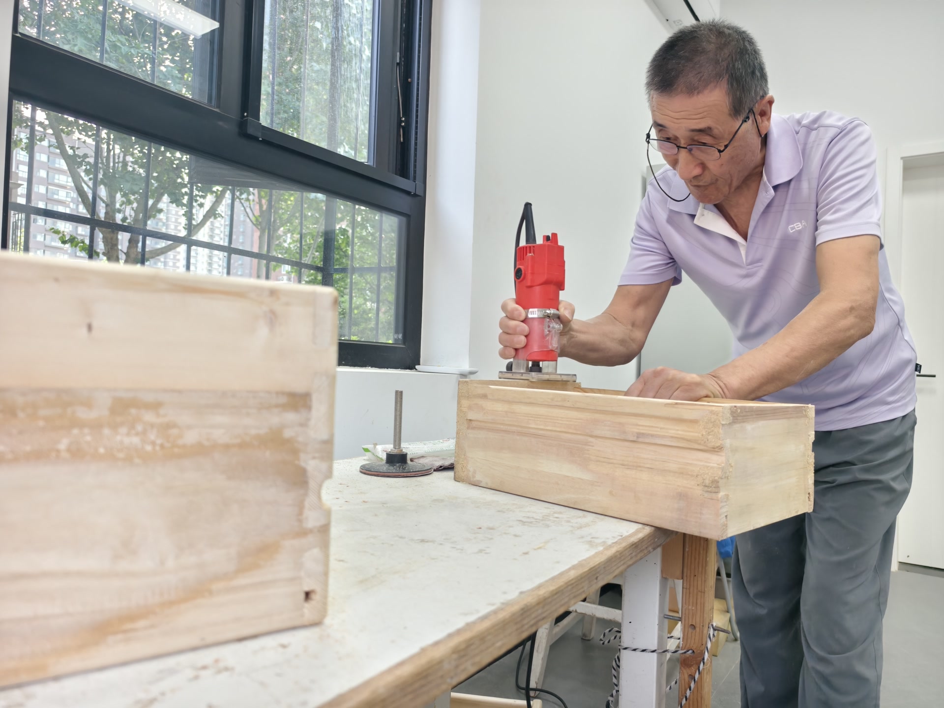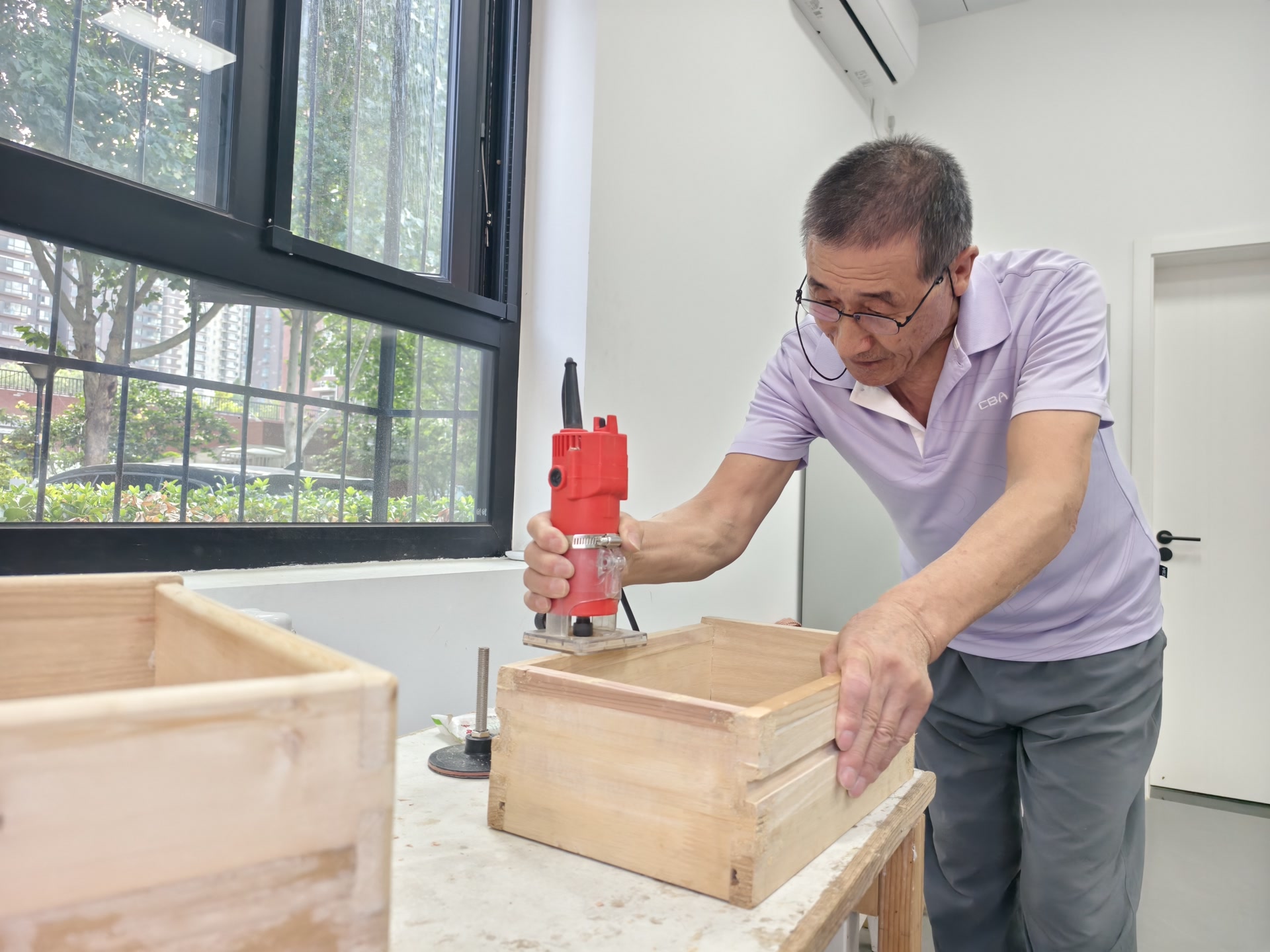 推开“木工坊”的门,不大的屋子里摆放着各种木工工具,老杨正在打磨一个即将完工的抽屉。只见抽屉采用的是榫卯结构制作,滑道、边角都打磨得很是圆润,手艺真是不错。