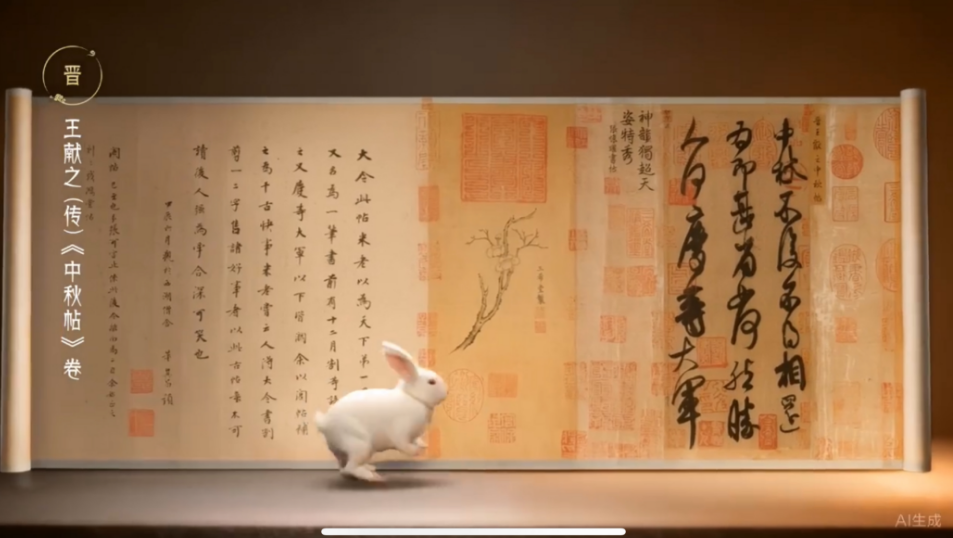 今年是故宫博物院建院100周年。在该AI创意短片中,太和殿前的铜龟被玉兔唤醒,王献之的《中秋帖》灵动飘扬,三彩马扬蹄而起奔赴月宫......紫禁城中的文物瑰宝在AI大模型的助力下向观众生动“走”来。