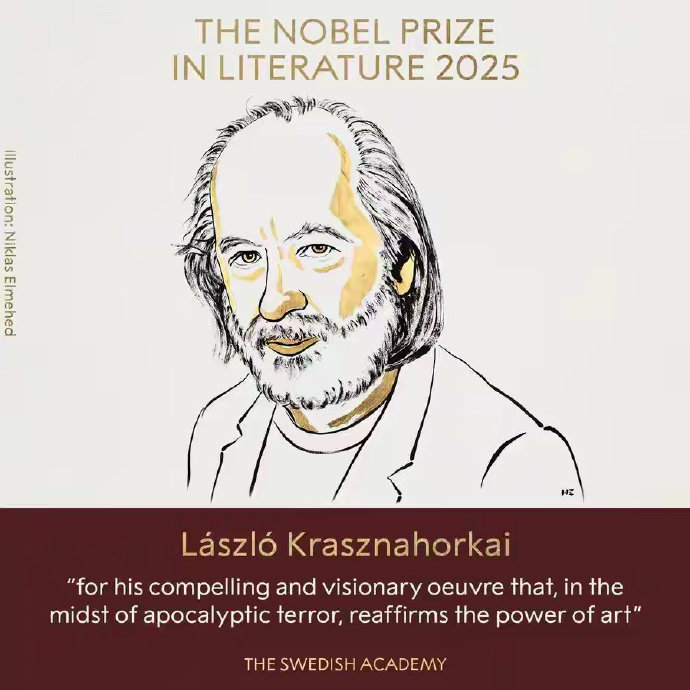 瑞典斯德哥尔摩当地时间2025年10月9日13:00(北京时间19:00),瑞典学院将2025年诺贝尔文学奖颁给了匈牙利作家拉斯洛·卡撒兹纳霍凯,以表彰其“在末世恐惧中仍能通过震撼人心且具先知般洞察力的作品,重申艺术力量”的杰出成就。