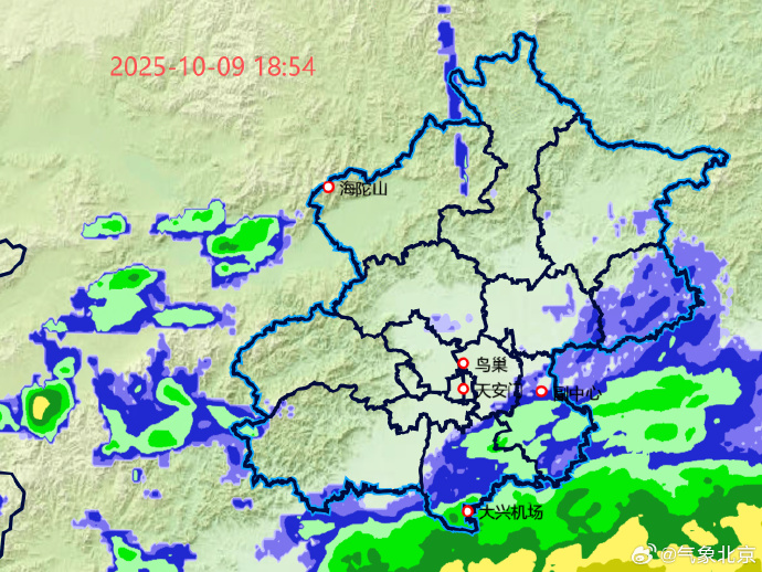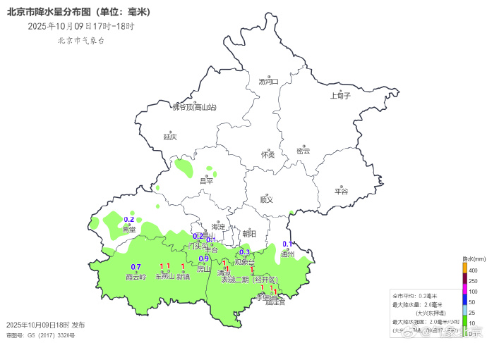 9日08时至18时,全市平均降水量14.4毫米,城区平均14.9毫米,最大降水量出现在大兴敬贤家园52毫米;最近一小时(17-18时)最大降水量为房山三座庵,2毫米 。