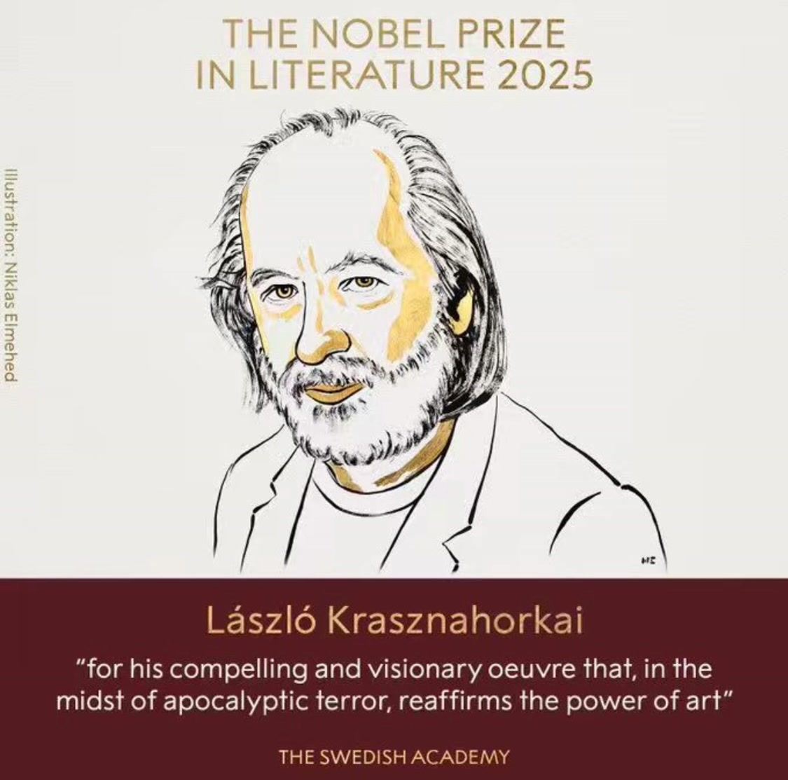 北京时间10月9日19时许,2025年诺贝尔文学奖揭晓,匈牙利作家拉斯洛·卡撒兹纳霍凯(László Krasznahorkai)凭借其“引人入胜且富有远见的作品”获奖,评委会特别强调其作品“在世界末日的恐怖中,再次证明了艺术的力量”。