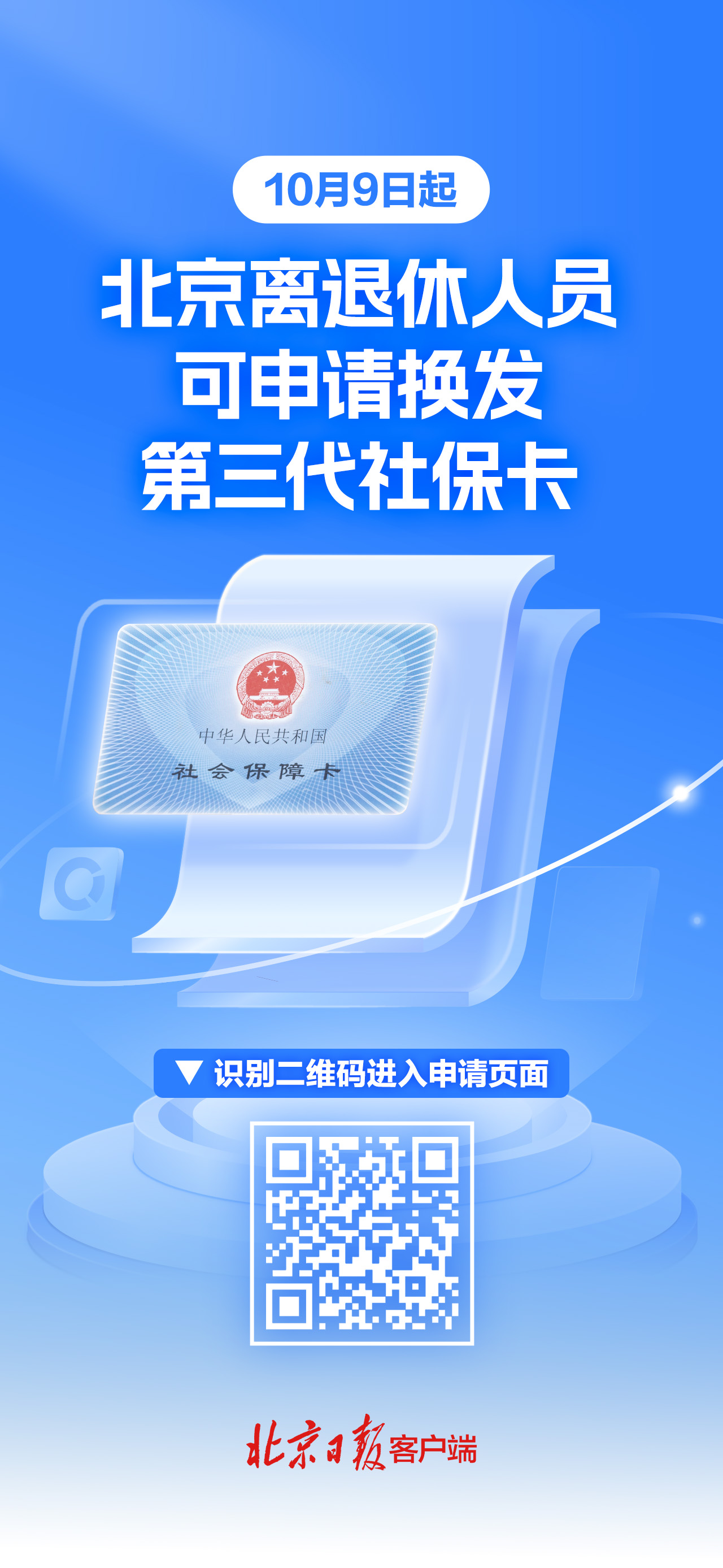 10月9日,北京市人力资源和社会保障局发布消息,全市启动第三代社保卡第五批集中换发,北京离退休人员(含超转人员等,下同),可通过北京市人社局官网、“北京人社”微信公众号等线上渠道申领。