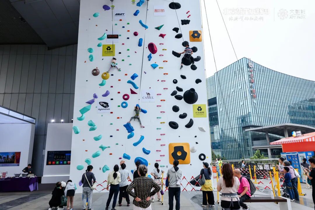 与此同时,中关村大融城则通过“北京城市更新周”推出了更具参与性的体育项目——户外攀岩体验。商场外立面设置的21米高攀岩墙,以16条专业赛道的规模,创造了北京室外城市攀岩的新高度,成为黄金周期间备受瞩目的“打卡地标”。