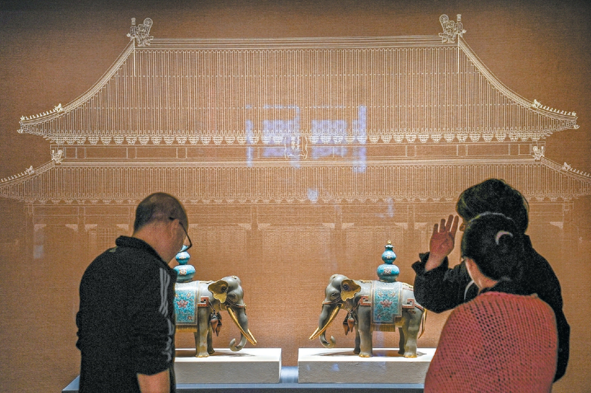 “百年守护——从紫禁城到故宫博物院”大展中,参观者在一对掐丝珐琅太平有象前驻足。