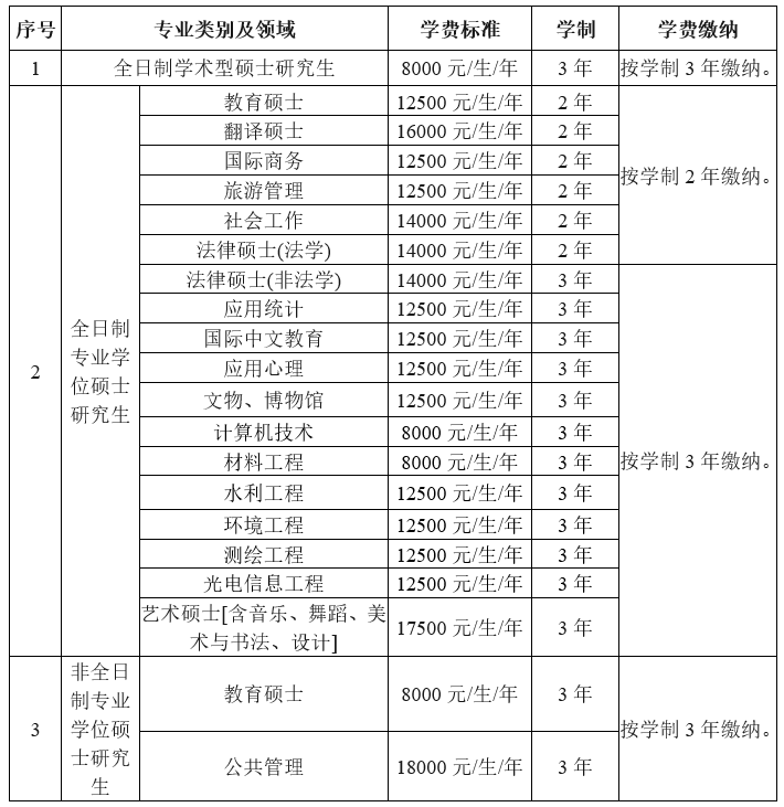 我校硕士研究生学费标准和学制一般如下表所示,每学年第一学期开学报到前缴纳学费。2026年学费标准如有变化,将另行通知。