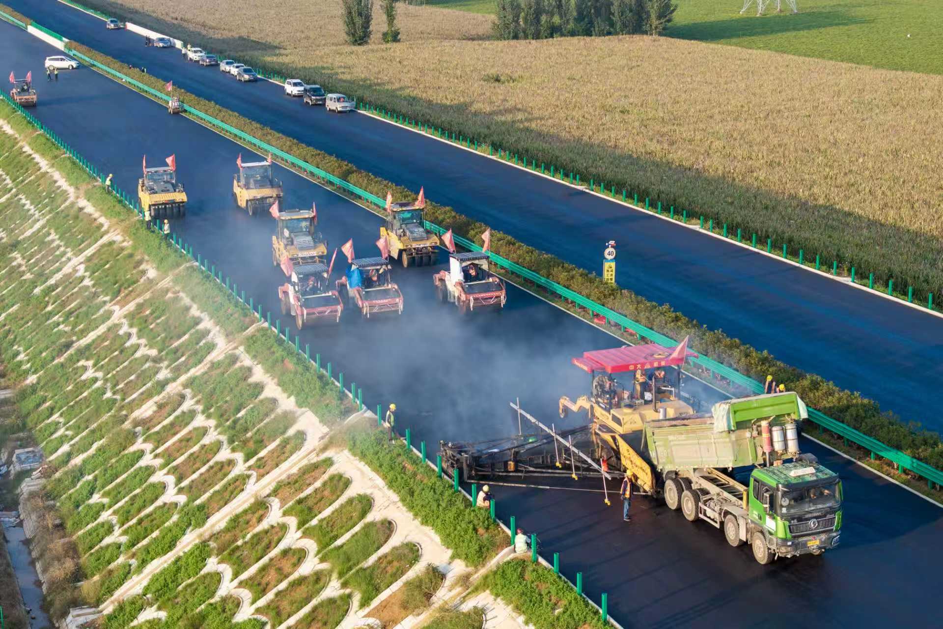 节日期间,沁伊高速1标段施工现场一派繁忙,运输车、压路机等数十台大型设备轰鸣作业,百余名建设者奋战一线,加速推进沥青上面层摊铺及交安、绿化、机电等附属工程施工。据项目负责人王海介绍,该标段全长20.8公里,目前已摊铺沥青超过24万吨。