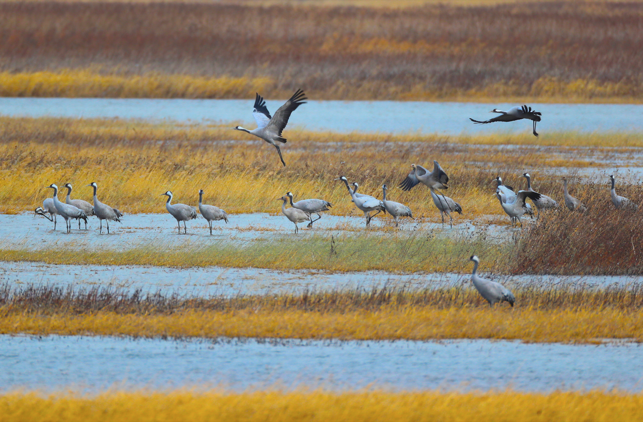 天气是鸟类迁徙最重要的因素,碰上雨雪或大风天气,候鸟就不爱长途飞行,也不怎么愿意降落。“云破日出之后,鸟群能够看清地面的坐标,开始小规模降落。”李理说,很多鸟降落后都会张开翅膀,脚丫往前伸展着,做“刹车”的动作。站稳之后,它们以家庭为单位钻进芦苇荡觅食。