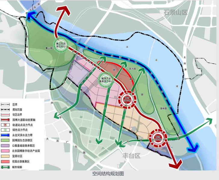 该区域空间结构为“一轴一带、两片融合、多廊渗透、多点激活”,其中“一轴一带”指园博大道联动发展轴、永定河滨水活力带,“两片”指北京园博数字经济产业园、园博园,“多廊”指长顺一路、二路、三路与园博园南路绿色廊道,“多点”指鹰山生态活力中心、数字产业服务活力中心两处绿色活力节点以及两处轨道站点活力节点。将依托蓝绿环抱、山水相依的生态景观本底,构建“一环四廊链山水、一轴多点展门户”的整体景观格局,塑造河西地区重要门户形象。