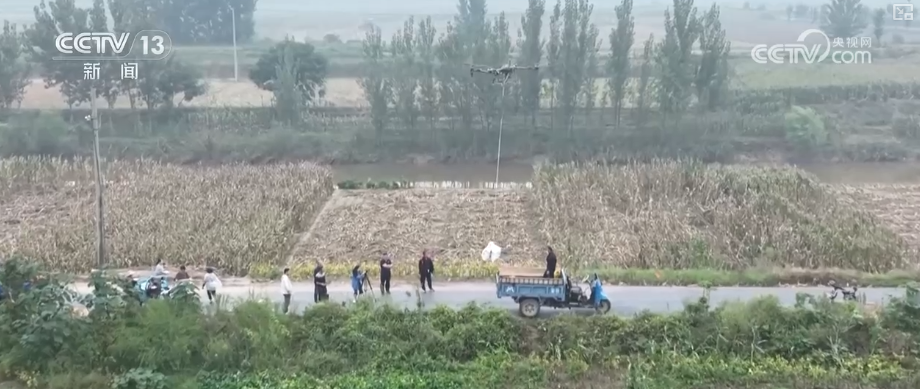 在菏泽定陶区的多块玉米地里,一台台植保无人机搭载着专业的吊装设备往来穿梭,将一袋袋玉米从空中转运到停在地头的运粮车上。