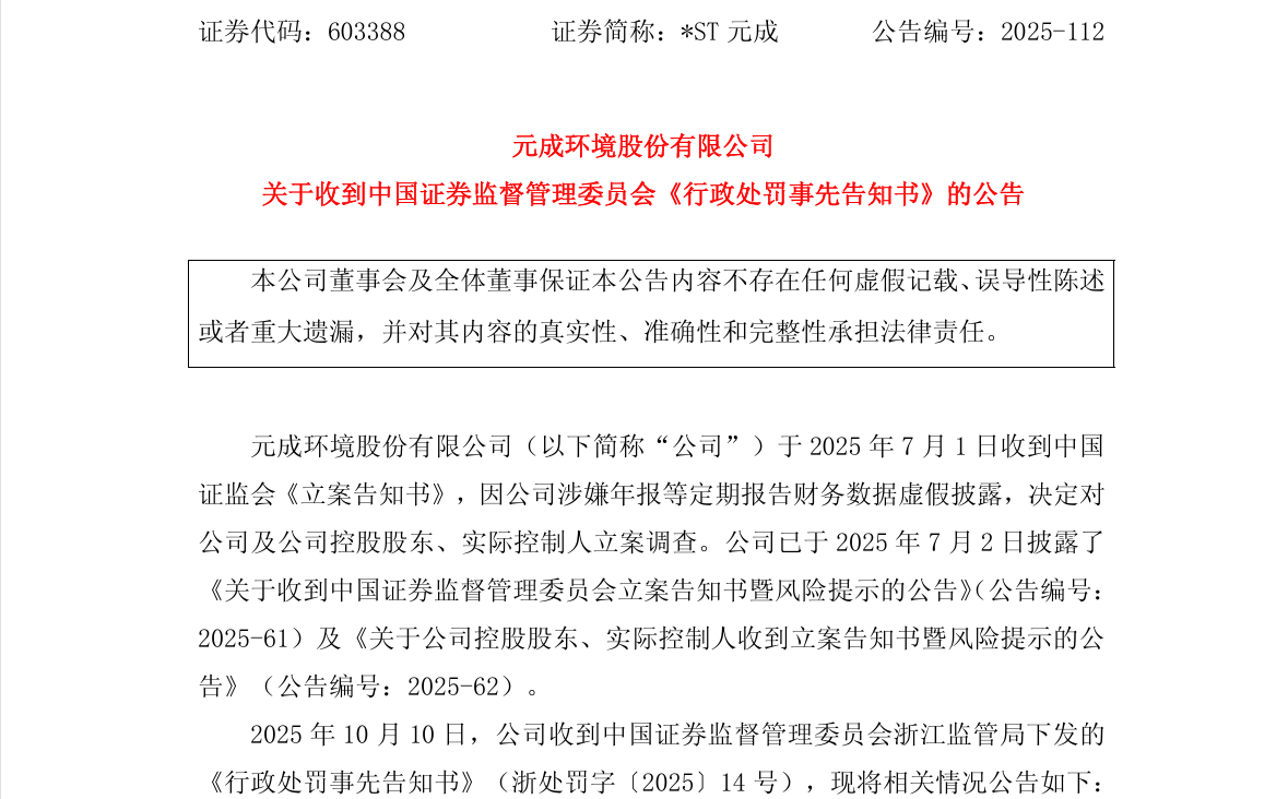 10月10日晚,中国证监会通报,近日对上交所主板上市公司元成环境股份有限公司(简称*ST元成)涉嫌定期报告等财务数据存在虚假记载作出行政处罚事先告知。*ST元成涉嫌触及重大违法强制退市情形,上交所将依法启动退市程序。
