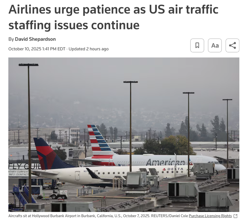 同时,政府关门带来的人员紧缩已让美国多座主要机场出现航班延误,空管系统承受的压力明显上升。路透社也提到,目前FAA在多地空管中心人手不足,运营效率下降,虽然发射本身优先级高于民航,但系统性的压力仍可能造成调度风险。