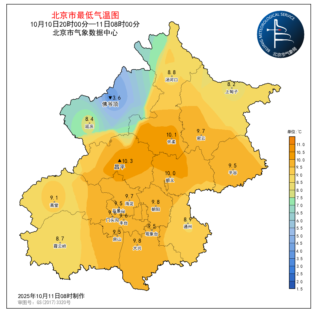 昨天(10月10日08时至10月11日08时),南郊观象台最高气温13.8℃(11:36),最低气温9.5℃(04:03)。