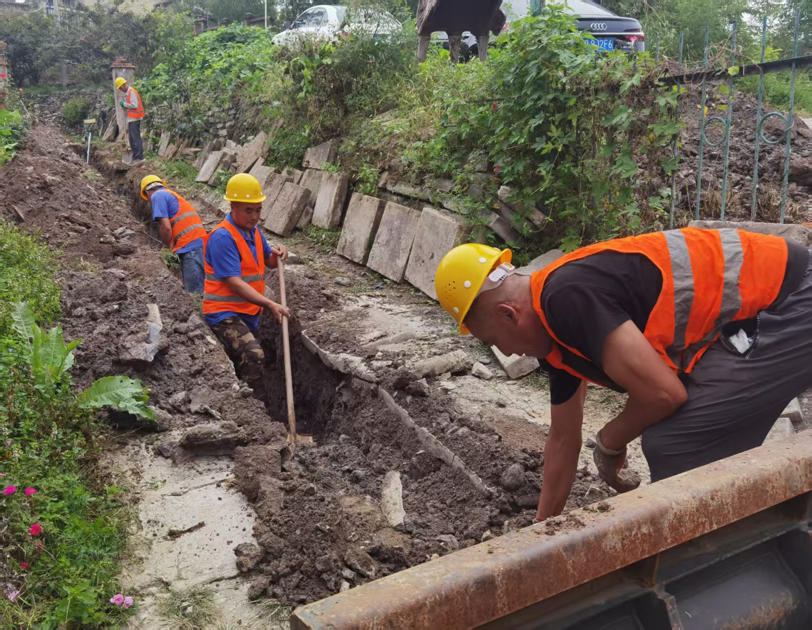 8月初,供水管线施工正式开始。主管道施工采用随挖路面、铺设管道并夯实回填的作业方式,最大程度降低施工对道路通行的影响,及时用混凝土分片硬化、恢复路面;主管道施工完毕后,铺设居民家入户管线。考虑到山上土石结构中碎石的影响,新管道采用抗压抗腐蚀性强的薄壁不锈钢管材,在铺设管道前会在地基底部铺砂,减少管道因受力不均或外部冲击造成的破损;回填完毕后进行夯实处理,确保地基稳固,也避免因山区降雨较多造成不必要的沉降。