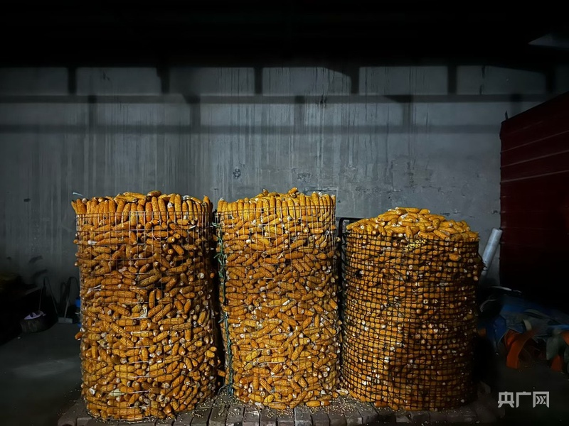 安阳内黄县丁先生用通风透气的铁丝笼存储玉米棒,置于自家带棚庭院内。(受访者供图)
