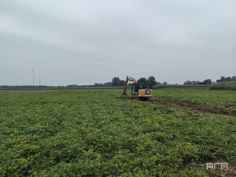 在河南兰考县,为了应对降雨造成的轮式机械无法进地收割,临时将一台履带式挖土机改装成花生收获机,下地作业。(受访者供图)