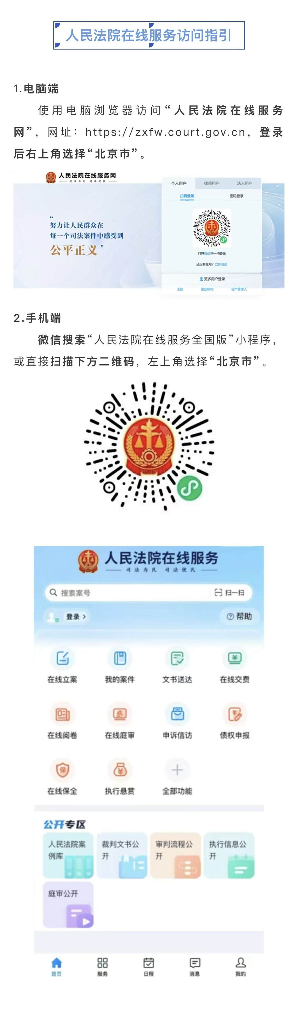自2025年10月15日9:00起,北京法院正式启用全国法院统一的电子诉讼服务平台,包括“人民法院在线服务网”(电脑端)和“人民法院在线服务全国版”(微信小程序)。新平台整合立案、调解、执行、信访、保全等多项业务,实现一网通办,首次登录需要注册并验证身份。平台切换之前未提交或已退回的立案申请需在“人民法院在线服务网”(电脑端网址:https://zxfw.court.gov.cn)或“人民法院在线服务全国版”(微信小程序)填写信息并提交。不便之处,敬请谅解。