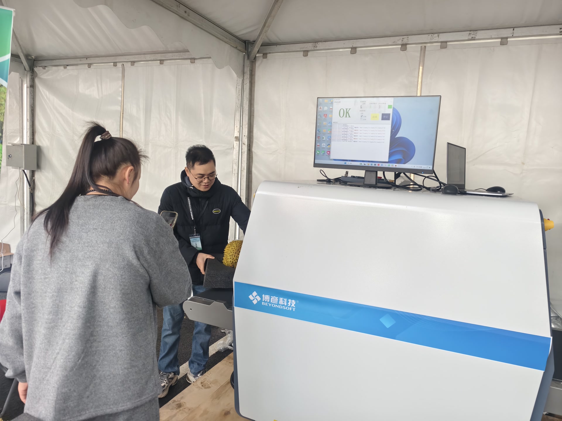 “挑榴莲,之前都是靠人工经验。我们员工的手经常被扎,还经常‘看走眼’,尤其是走电商,要是发出去一个坏果、生果,那就赔大发了!”一位经营榴莲的商户为这款分选仪点赞,详细地了解着它的性能、价格。