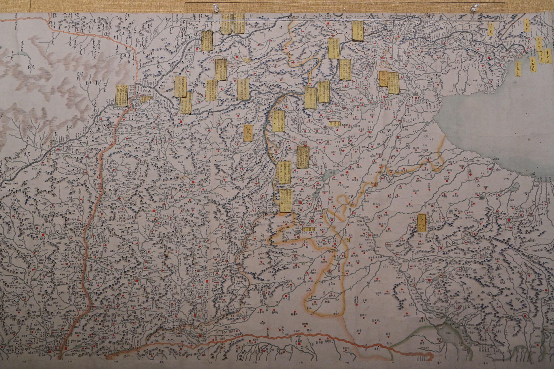 这组文物下方,首次亮相的《皇舆十排全图》(第六排)为清乾隆木刻设色本,尺幅巨大。“其蓝本成图于雍正时期,曾经深藏内府,秘不示人。该图以北京中经线为本初子午线,纬线也以北京居中,各种图例的编配既醒目又清晰,不仅体现了中国古代地图严谨、古朴的风格,更反映出清朝皇帝对大一统疆域的认识。”一史馆展览教育处副处长吴焕良介绍,本次展览选取金瓯永固、蟾宫折桂、良辰美景、福寿康宁等10个主题,由一史馆和故宫分别选取了50件套代表性展品,为清宫旧藏档案文献与相关文物创造重逢机会。