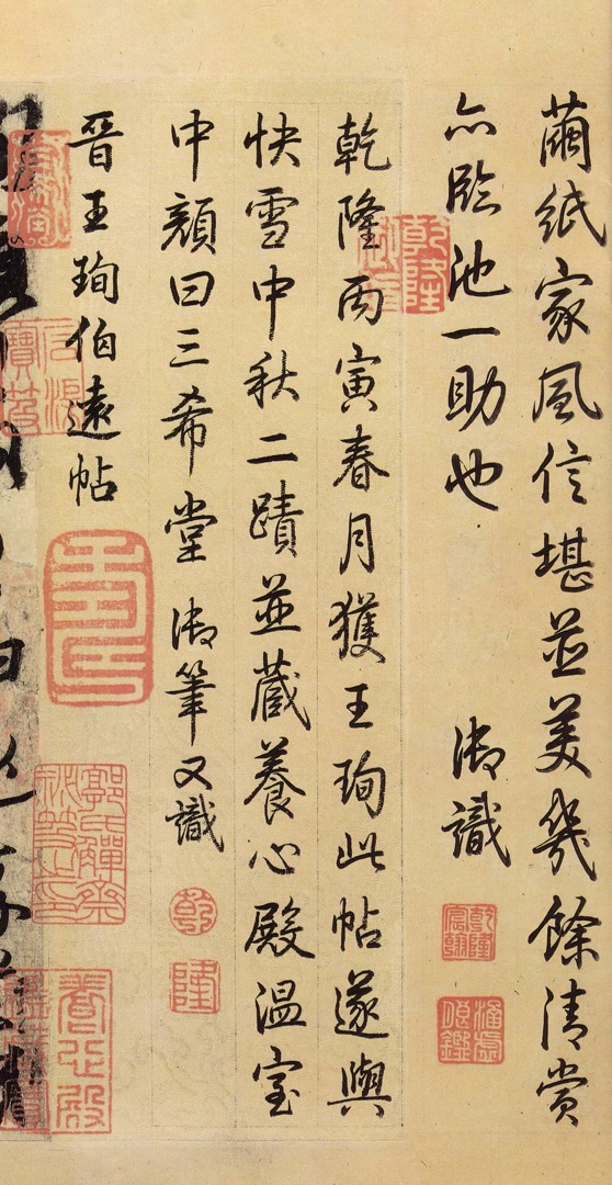 《伯远帖》在宋代及以后颇为人所重,《宣和书谱》《画禅室随笔》《书画记》《平生壮观》《石渠宝笈·初编》《古书画过眼要录》等均有著录。此帖至乾隆时入内府,乾隆皇帝钟情于魏晋风神,将书斋以“三希”命名,又于乾隆十二年(1747),将“三希”与内府所藏魏晋唐宋元明书家真迹,摹勒上石,刻为《三希堂法帖》。于是,此刻本便是我们今天所见《伯远帖》版本中十分重要的一种。不过三希堂本《伯远帖》改变了原帖的章法,分原帖五行为六行,打破了原帖的雍容排布;又将原帖中虚行圆转的笔画刻得实在不少,如“游”字之平捺刻出了明显的捺脚,削弱了原帖的萧散气息;比原帖在神韵上相差甚远,亦逊于明《馀清斋法帖》刻本。乾隆皇帝的钟情不仅在于刻帖,还在于临帖,他曾于乾隆十二年精心临习三帖,不过其中所临《快雪时晴帖》笔力过瘦,所临《中秋帖》章法过散,惟所临《伯远帖》于气息上与原帖略近,可以一观。