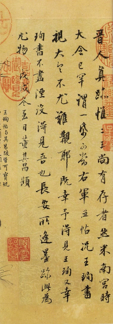 从一封小小的书札中,我们得以窥见一个令人神往的时代,读其书、文或可暂得其中神韵,助长精神。董其昌跋此帖曰:“晋人真迹惟二王尚有存者。然米南宫时大令已罕,谓一纸而当右军五帖,况王珣书视大令不尤难觏耶!既幸予得见王珣,又幸珣书不尽湮没得见吾也。长安所逢墨迹,此为尤物。”在历史的风烟中,幸而《伯远帖》又流传至今,见与被见,都值得珍惜。