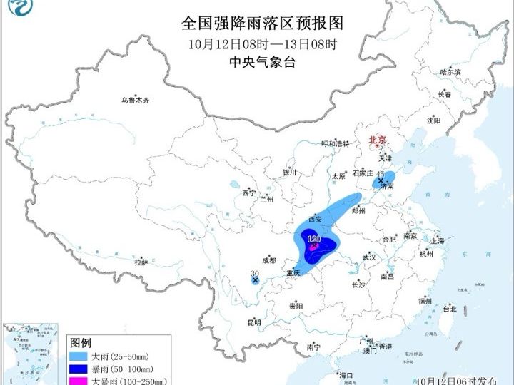 预计,10月12日08时至13日08时,陕西南部、四川东北部、重庆大部、湖北西部、山西南部、河南西部、山东西北部等地部分地区有大到暴雨,其中,重庆北部等地局地有大暴雨。上述部分地区伴有短时强降水,局地有雷暴大风等强对流天气。详情>>