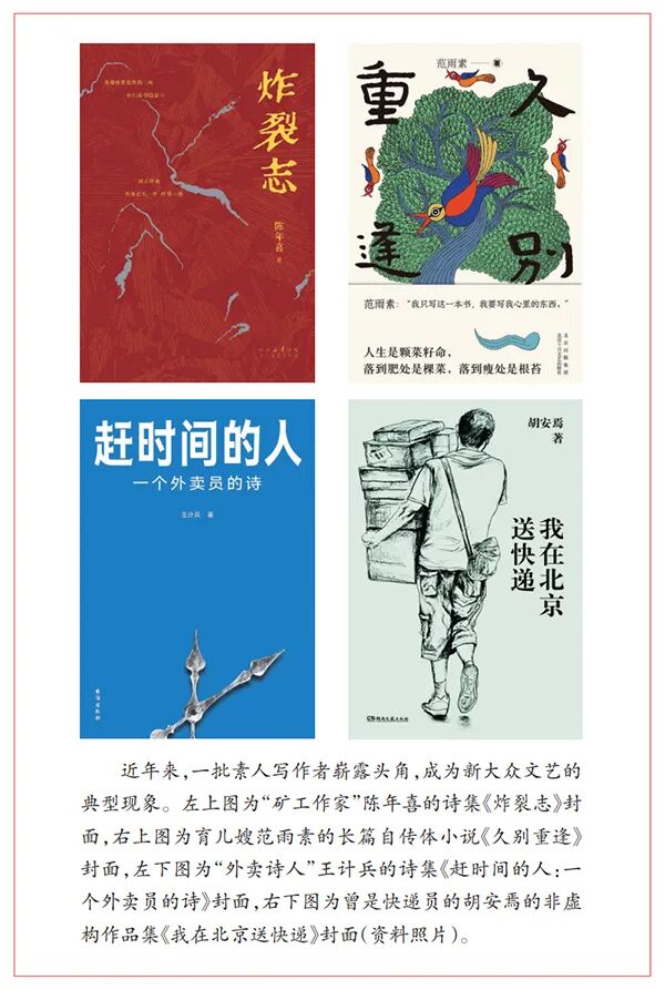 王计兵:素人写作其实一直存在,比如一些文学大家,他们在成名之前,很多都是素人。我们今天所说的素人写作,大多是指在网络环境下展现出来的普通人的写作现象。比如矿工、商贩、出租车司机、外卖员,他们都是广大人群中普普通通的一员,却因写作被甄别出来。素人写作因为更加贴近大众生活,容易被读者接纳。就像我曾在笔记里写过的感受:“我们终因普通而不凡。”素人写作的特质,在于大多有浓郁的情感与真实的生活。以我自身为例,我既是“外卖骑手”中的一员,也是“外卖骑手”的观察者。我会观察他们的日常、他们的语言表达,并整理成作品。去年,我出版诗集《低处飞行》,选“飞行”这个词是因为联想到我们的工作状态几乎都是贴地“飞行”,想传递的生活态度就是:我们有“翅膀”,无论所处位置高低,只要我们愿意,每个人都可以“飞行”。当然,素人写作者走进大众视野后,应该更加努力,不能让“素人写作”的标签拉低了新大众文艺的高度。