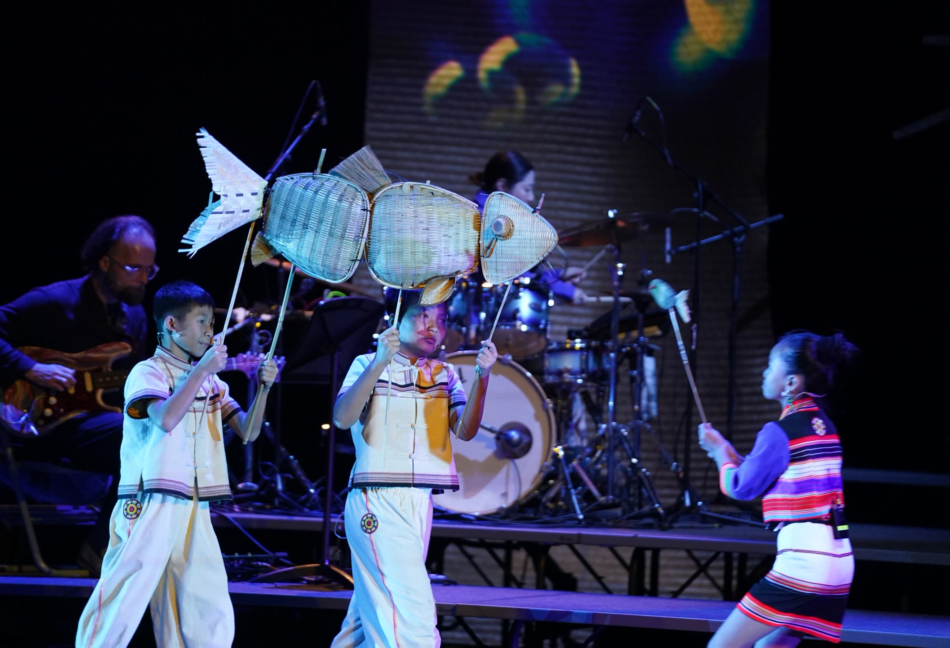 演出现场,赤脚的孩子们由基诺族大鼓舞国家级非遗传承人何桂英带领,载歌载舞,烂漫尽兴。踩着完美错(Ok Miss)乐队演奏的丰富多变的音乐节拍,他们唱起《贝壳歌》等古老的歌谣,手举簸箕、扫帚、蓑笠编成的偶具,不断拼成故事里女孩想象的天然万物。处理走位、配合调度时,孩子们的表现时常难脱青涩的稚嫩,但更加可贵的勇敢、真诚、灵气,在谢幕时收获了观众热烈的肯定与喝彩。