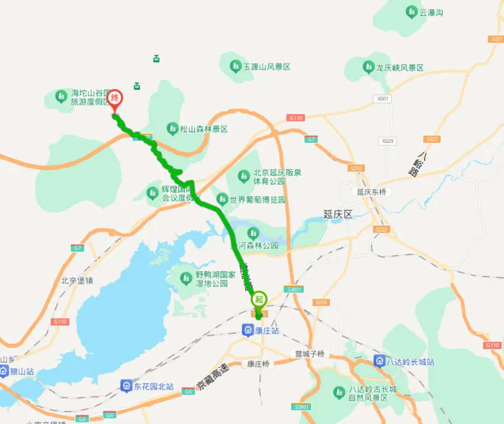 该路线起始于延庆区康庄镇,途经康张路、松闫路。游客在八达岭长城周边登长城赏红叶之后,沿着G6辅路继续向西行驶即可到达本路线的起点,沿着路线前行会经过新中国成立后建立的第一座大型水库—官厅水库,秋水与红叶交相辉映,尽享秋日自驾乐趣。路线周边还有野鸭湖湿地公园、北京世园公园、北京延庆奥林匹克园区等知名景点,游客可以通过康野路、康草路、百康路等路线前往景区赏秋游玩。