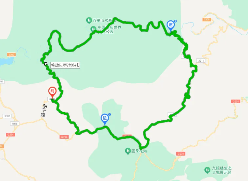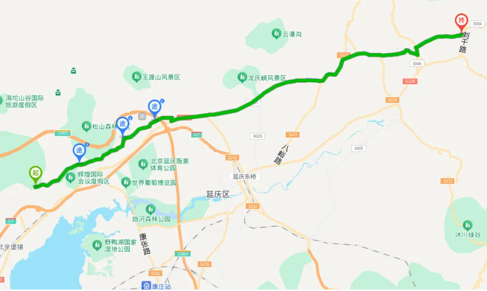 这条路线主要由古龙路、香龙路组成,串联起古崖居和龙庆峡两大景区,起点位于古崖居风景区,终点为香龙路与刘干路交叉口。本路线不仅是一条串联延庆北部山区的交通要道,更是一条穿梭在秋日彩林中的景观长廊。道路依着山形走势,有些地段落差比较大,呈U字型,行驶其中,极具视觉冲击力,尤其秋季最美,因此这条路线也是众多骑行与摄影爱好者的网红打卡圣地,古龙路也是此前热播电视剧《玫瑰的故事》取景地。