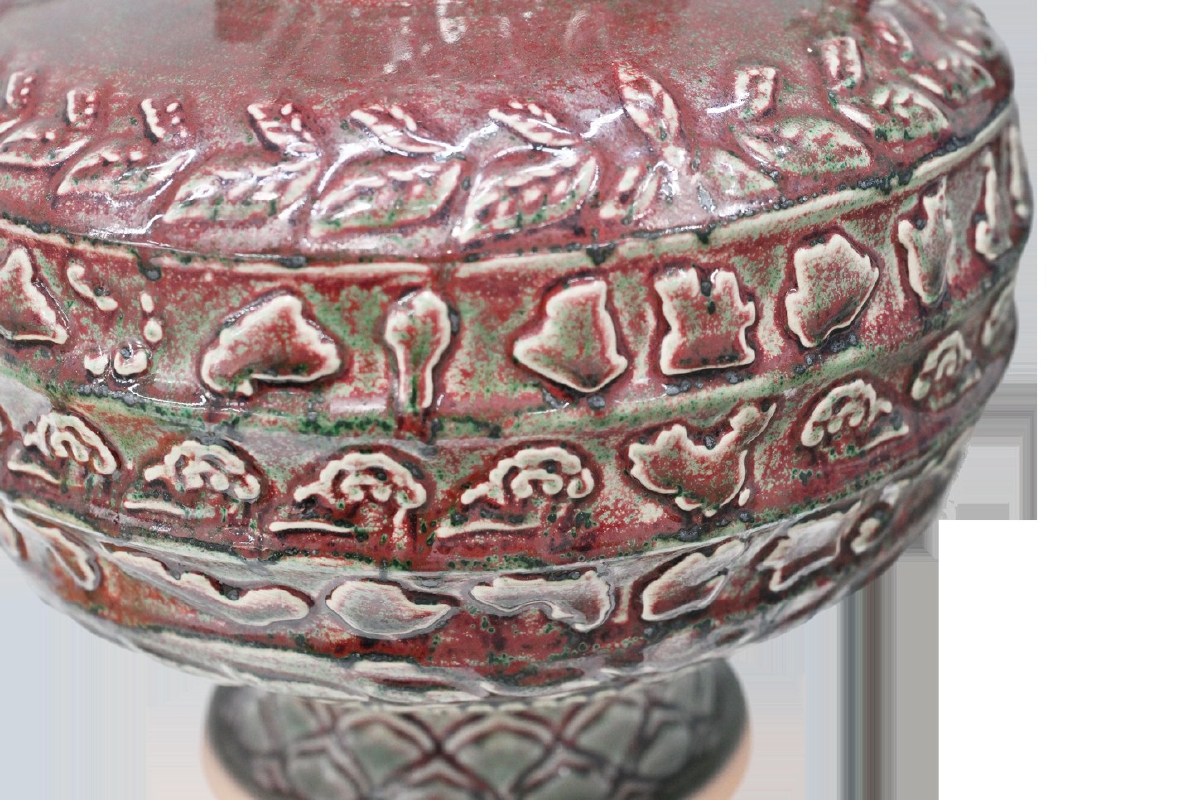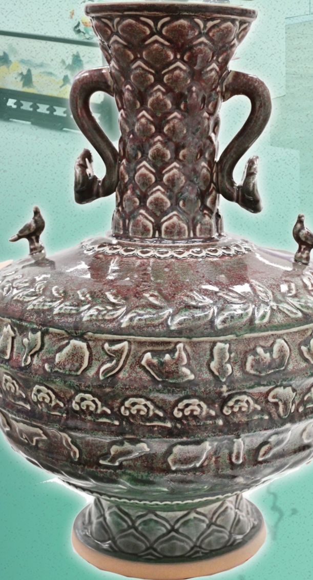 中国的英文单词是“China”,而将第一个英文字母改成小写后的“china”就是瓷器的意思,瓷器与中国文化紧密相连。本次展览中瓷器展品占了大部分,展览策展人白浩率先介绍了一件名为“盛世和平”的钧瓷瓷瓶,这件器物曾经赠予多位非洲国家领导人。白浩指了指瓷瓶腹部介绍:“这件瓷瓶纹饰大多采用高浮雕呈现。其中腹部共有三圈纹饰,上下两圈的纹饰分别刻画了非洲50余个国家的地图,上层浮雕中还有中国地图,而且中国地图对面雕刻着非洲区域地图。这样的设计预示着中国与非洲国家有着良好的合作关系。而腹部中间一圈的则是雕刻祥云图案,象征着吉祥瑞气,也承载了对美好未来的期许。”同时这件器物上还雕刻着橄榄枝纹、莲花纹等象征着和平、吉祥的纹样,两只和平鸽也在该器物的肩部相对而立,凸显其映射的和平主题。