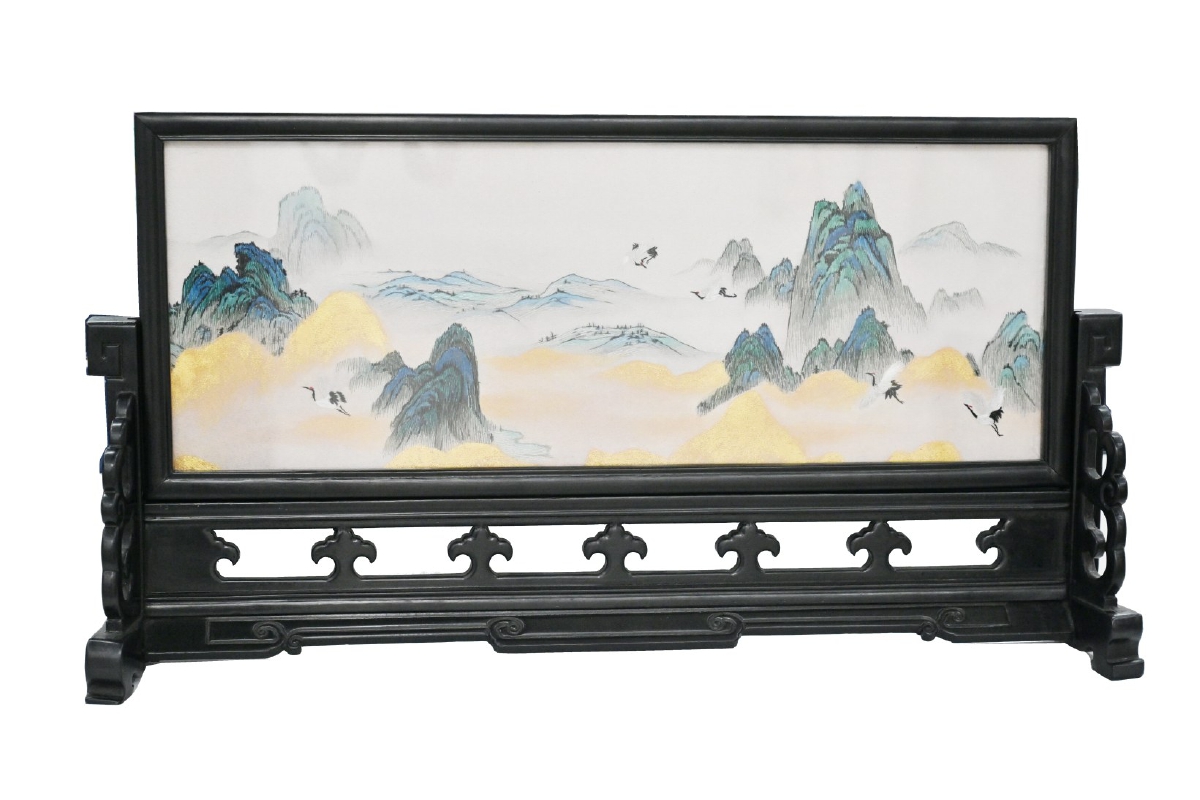 国礼“江山祥鹤图”历经半年时间创作,虚实对比、繁简对比的构图表现出中华山河的生动气韵和灵动秀美,上下结构和远近关系的整体布局构建出连绵起伏、祥鹤翩跹、旷达悠远的立体山水图景,一派欣欣向荣的景象。在艺术表现上完美融合了青绿山水与水墨山水,经丝线的层叠交织,形成强烈的视觉冲击和全新的审美体验。