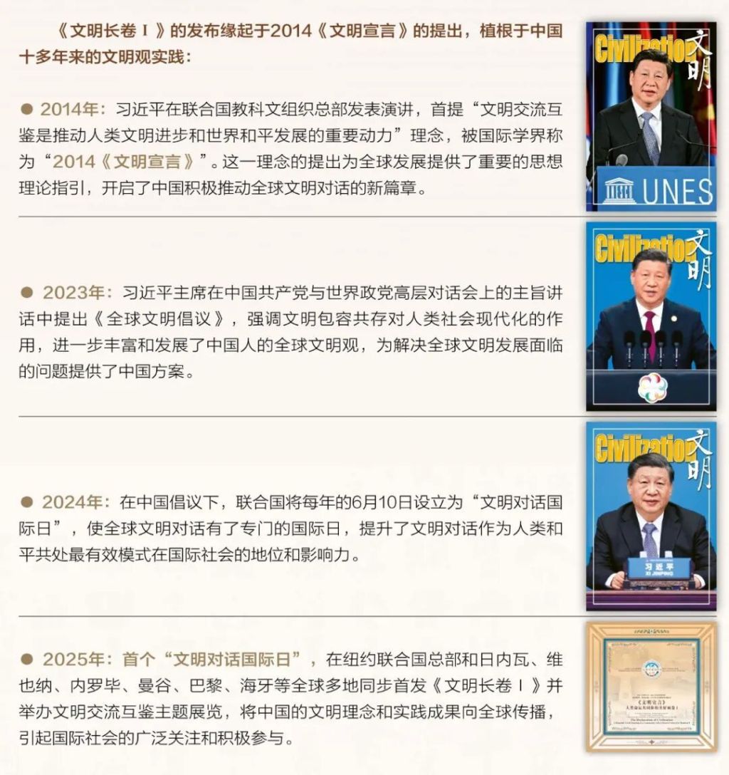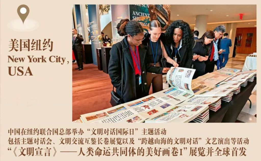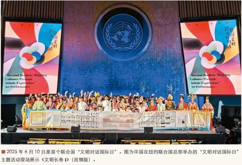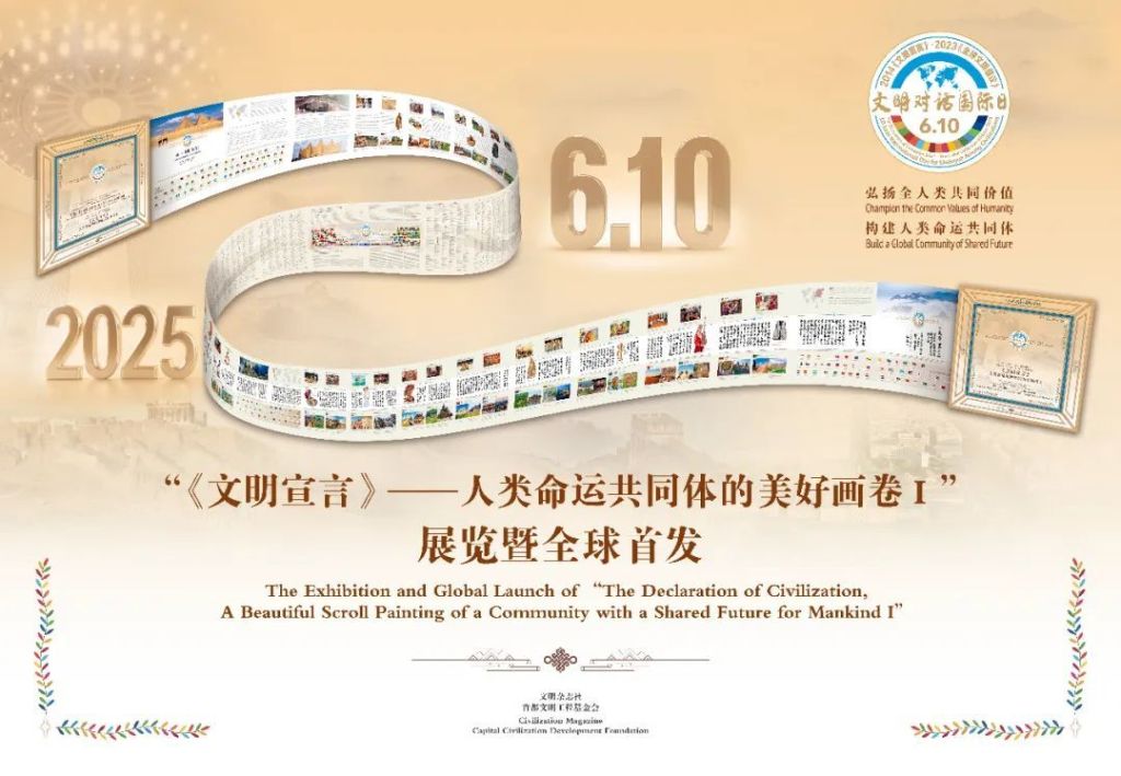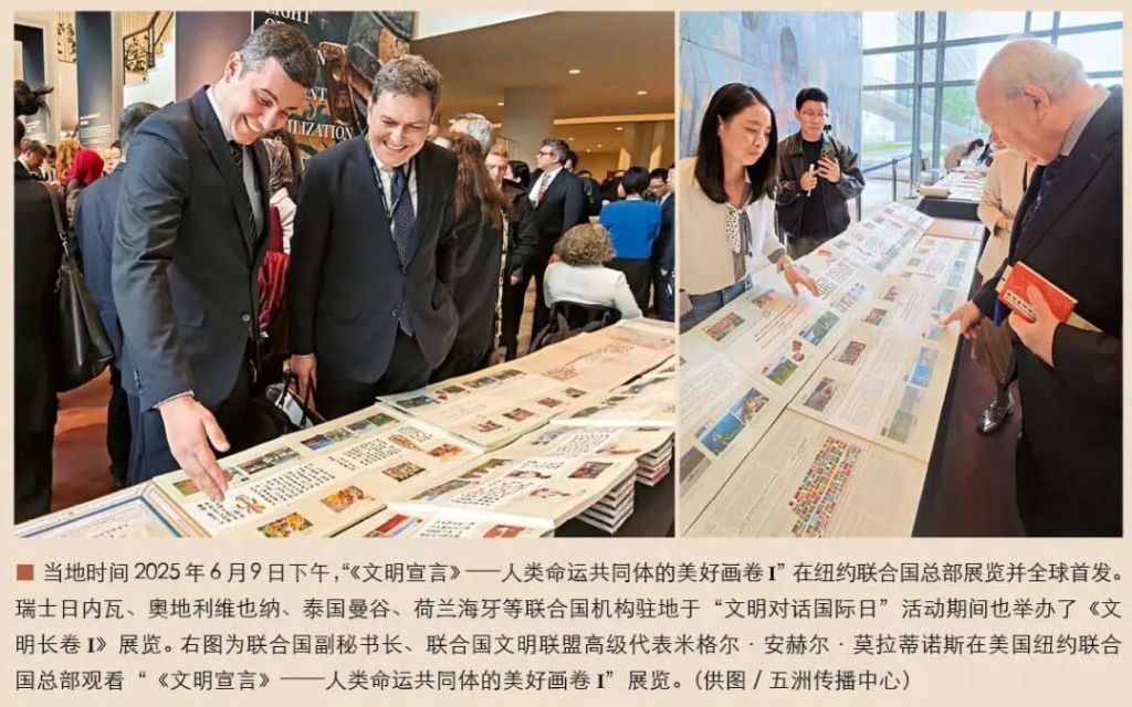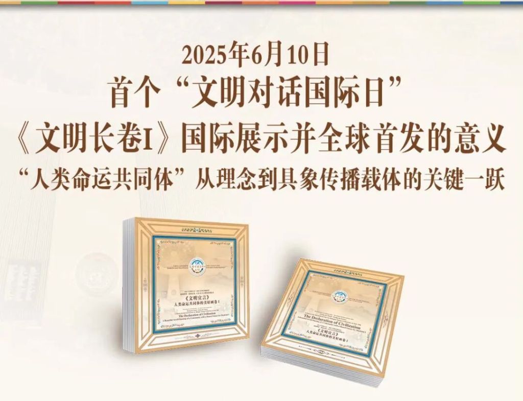 “《文明宣言》——人类命运共同体的美好画卷Ⅰ”(简称《文明长卷Ⅰ》)于2025年6月10日首个“文明对话国际日”在纽约联合国总部以及联合国专门机构或相关组织所在地,多地展示并全球首发,这是中国推动文明交流互鉴、践行全球文明倡议的标志性成果。