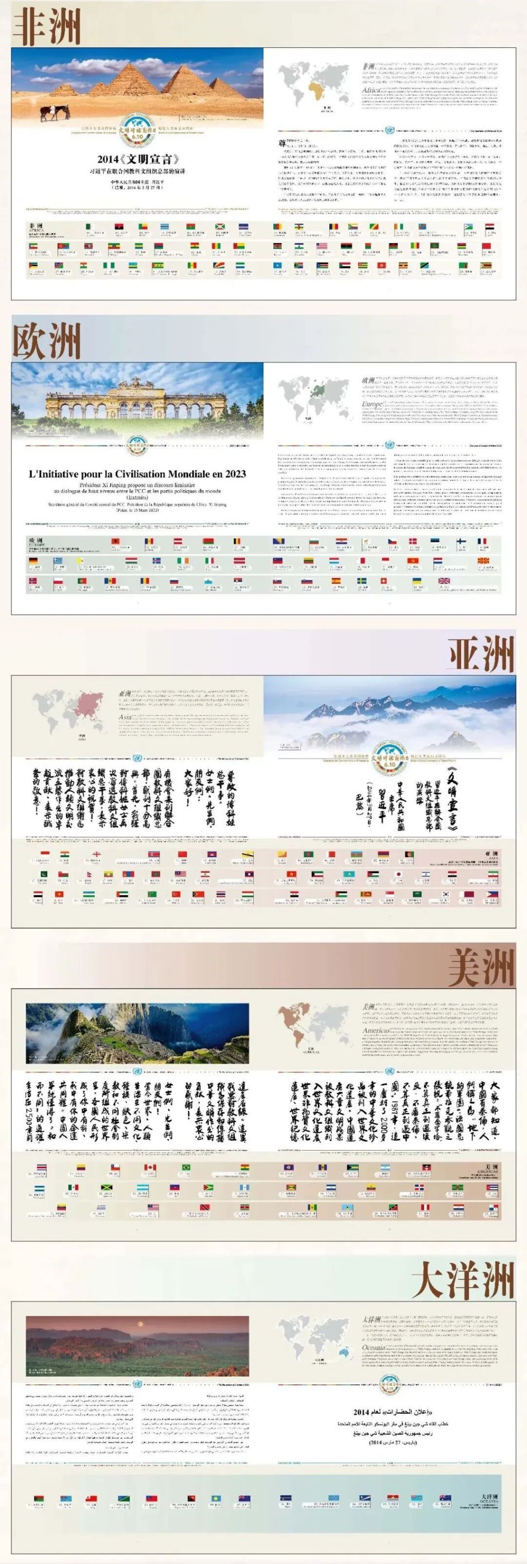 中轴以“联合国六种官方语言+中国书法”展示习近平主席2014《文明宣言》和2023《全球文明倡议》文本,形成“文明对话中枢”,象征着不同文明之间沟通和交流的关键节点和汇聚枢纽,旨在促进不同语言和文化背景的人们对文明理念的理解和交流。