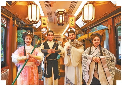 10月5日,湖北襄阳,“黄蓉”“郭靖”“诸葛亮”“黄月英”(从左向右)在“侠义襄阳”旅游公交上与游客互动。 杨东摄(人民视觉)
