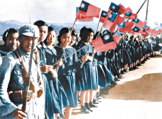 1945年10月,台湾女学生迎接国军到来。