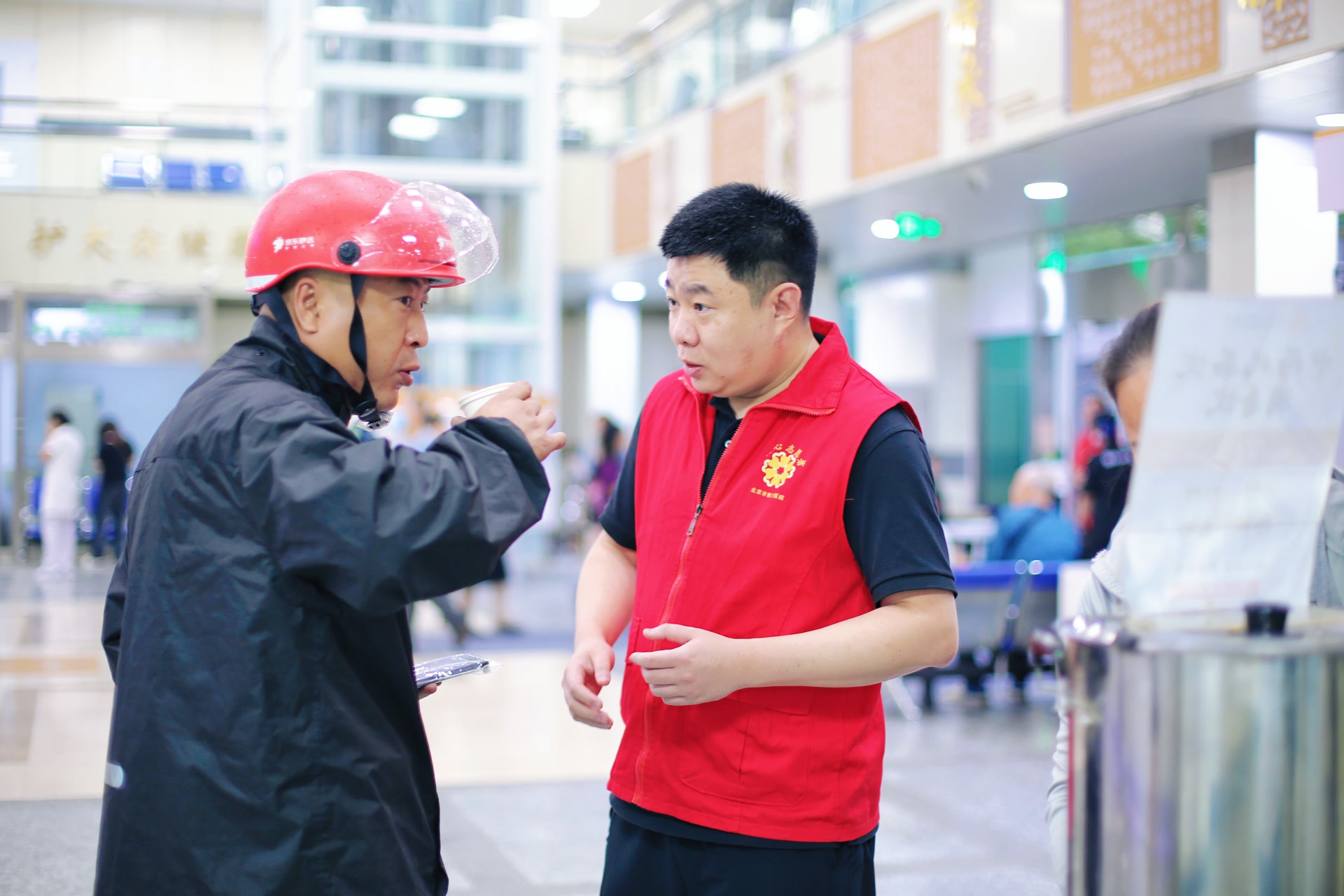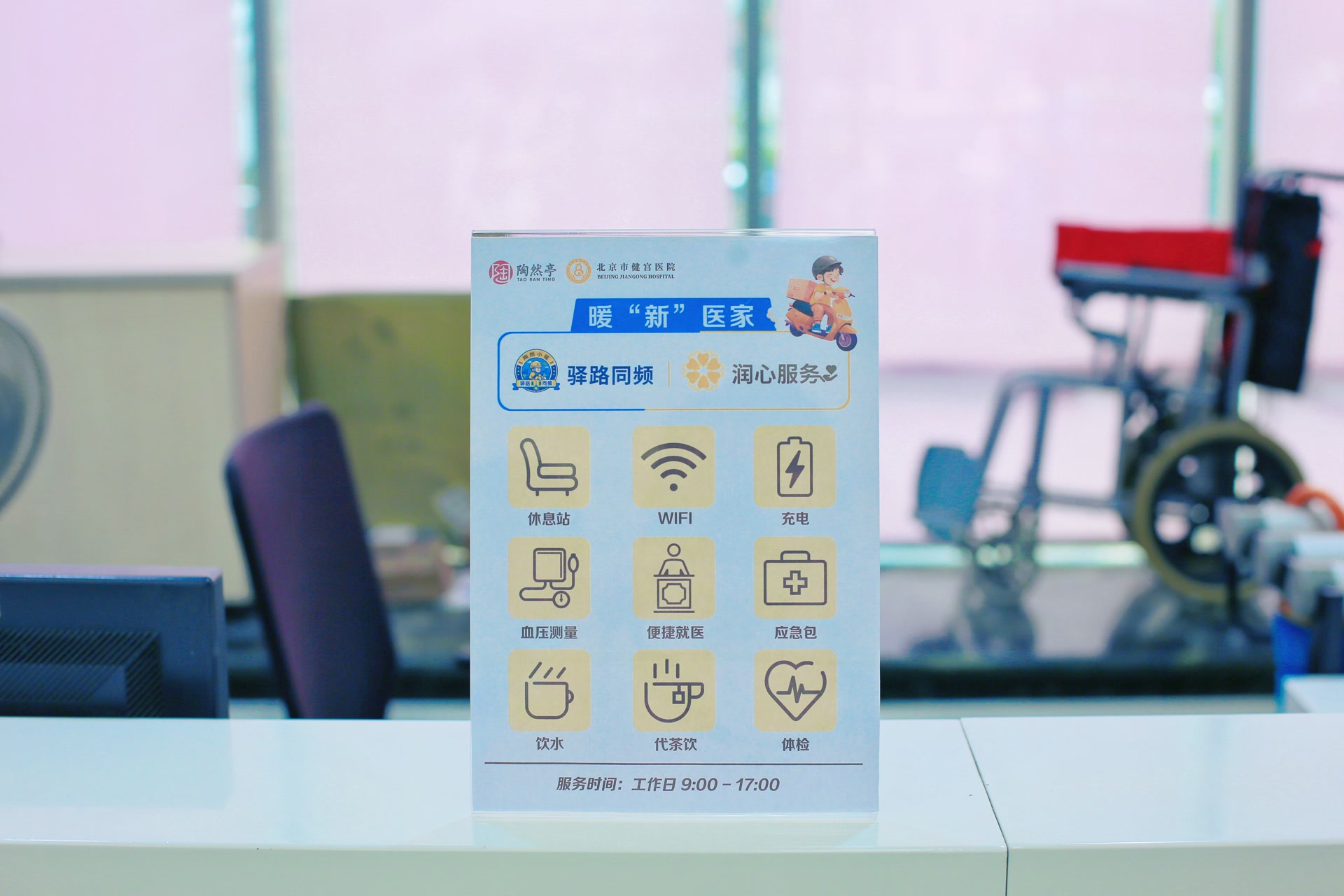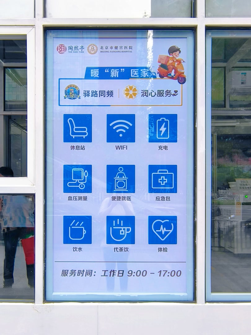 医院大门外,贴着醒目的“暖‘新’医家”标识,上面写着工作日9:00至17:00可提供血压测量、便捷就医、体检咨询、应急包等服务。门诊大厅服务台旁,“陶然小哥服务站”不仅设有休息区,还配备充电设备、雨衣、打气筒等应急物资,随时解决小哥们的突发需求。