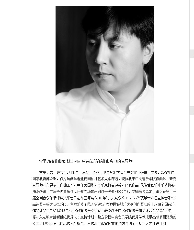 据央广网消息,常平,男,1972年6月出生,满族,毕业于中央音乐学院作曲专业,获博士学位。2008年由国家教育部公派,作为访问学者赴德国柏林艺术大学深造。现执教于中央音乐学院作曲系,研究生导师。主要从事作曲工作。兼任美国华人音乐家协会评委。