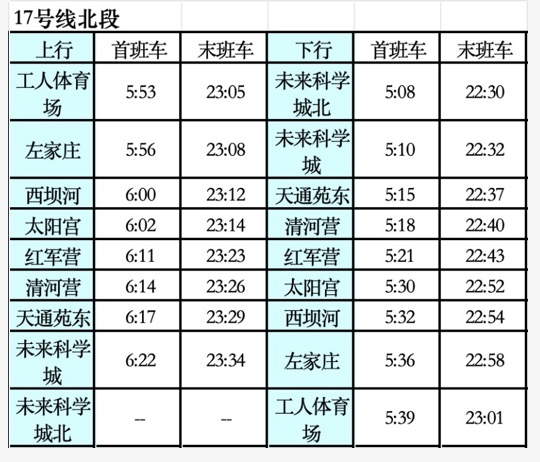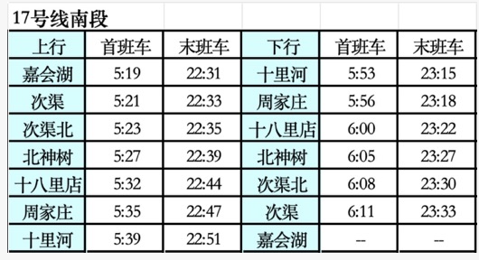 随着17号线启动贯通按图试运行,各站首末班车时间也有所调整,其中,17号线南段嘉会湖站至十里河站各站,首班车发车时间最多提前了12分钟,末班车发车时间最多延后了47分钟;17号线北段工人体育场站至未来科学城北站各站,首班车发车时间最多提前了12分钟,末班车发车时间最多延后了8分钟;17号线南段和北段全天运营时间增长,让地铁出行更加灵活、便民。