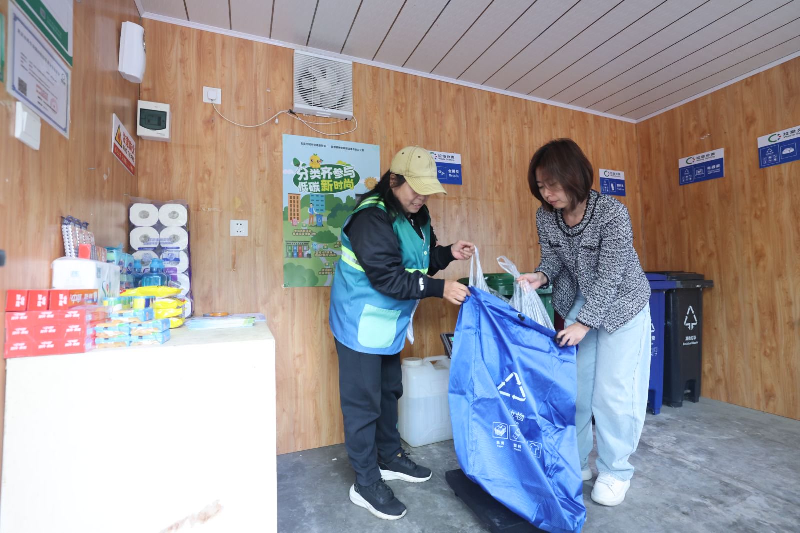 驿站里的工作人员不光收钱、记积分,还会耐心教大家怎么分好类,让每样可回收物都能“物尽其用”。